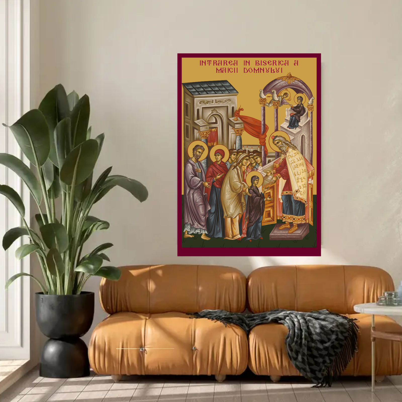 Aceasta icoana sacra reprezinta un moment important din viata Maicii Domnului, Intrarea sa in Biserica, fiind imprimata pe un suport MDF de calitate superioara, folosind tehnologia de imprimare UV. Detaliile rafinate si culorile intense redau cu precizie aceasta scena liturgica, aducand in fata privitorului o reprezentare vizuala a umilintei si sfinteniei Maicii Domnului.