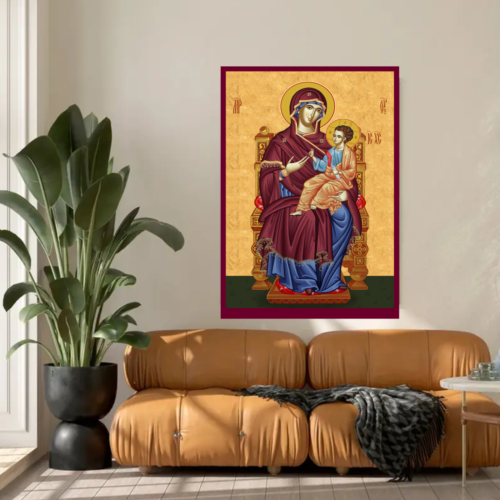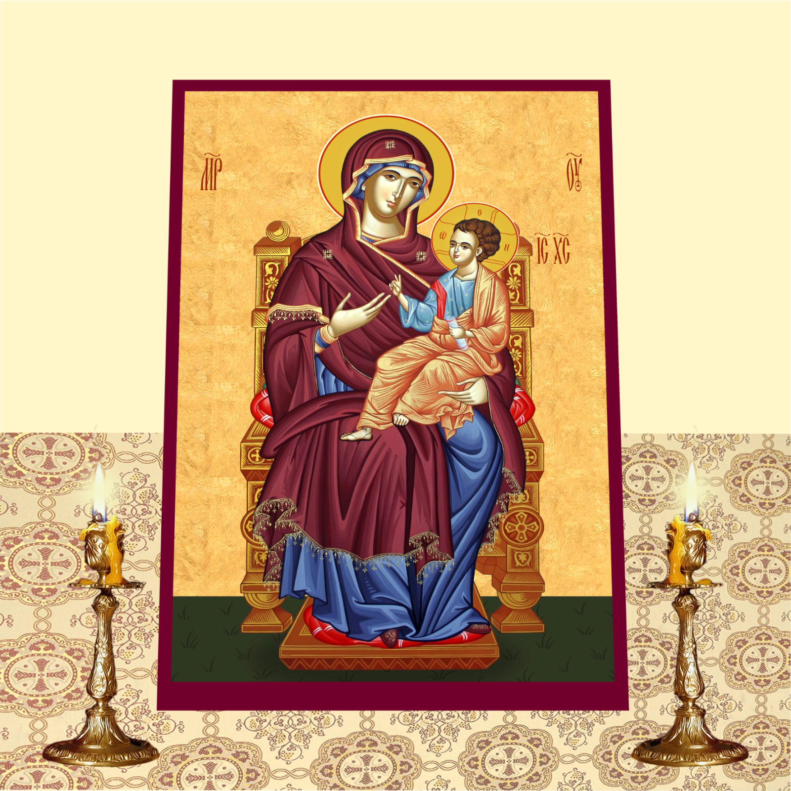 Design: Icoana o prezinta pe Maica Domnului pe tron, simbol al demnitatii imparatesti si al mijlocirii materne, inconjurata de detalii fine si tonuri calde care inspira pace si evlavie.