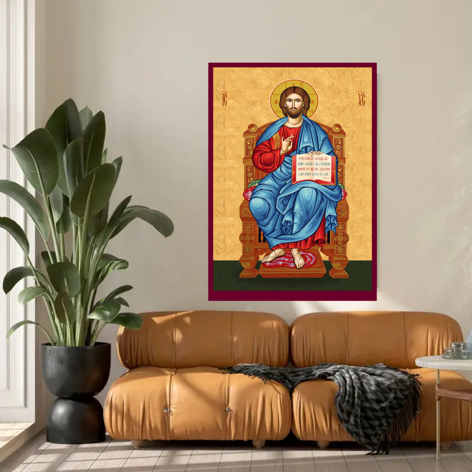 Aceasta icoana il prezinta pe Mantuitorul Iisus Hristos sezand pe tronul imparatesc, intr-o postura solemna, binecuvantand si tinand in mana Sfanta Evanghelie. Imprimata pe MDF de inalta calitate si realizata prin tehnologia UV, icoana ofera o imagine vie, cu detalii clare si culori intense, pastrand frumusetea si profunzimea traditiei iconografice.