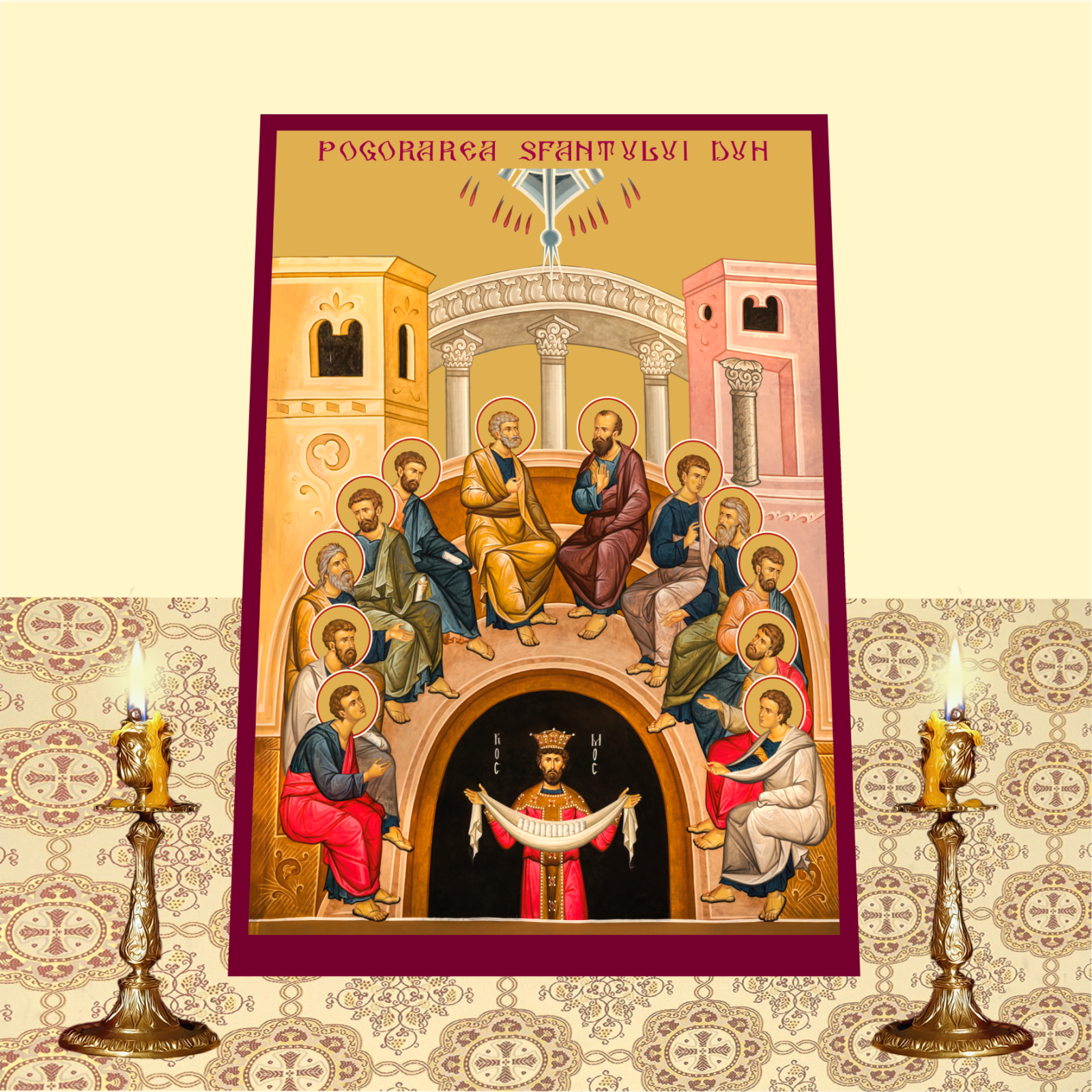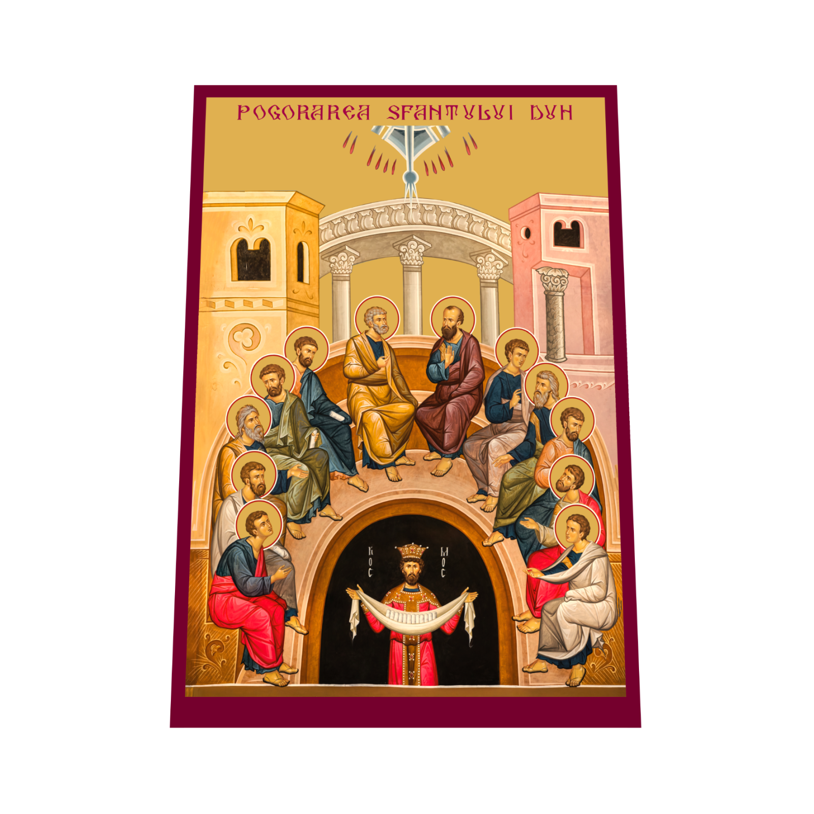 Design: Icoana reda momentul in care Duhul Sfant coboara asupra apostolilor, oferindu-le darul limbilor si puterea de a predica cuvantul lui Dumnezeu in toate limbile lumii. Aceasta scena simbolizeaza nasterea Bisericii si inceperea misiunii apostolice.
