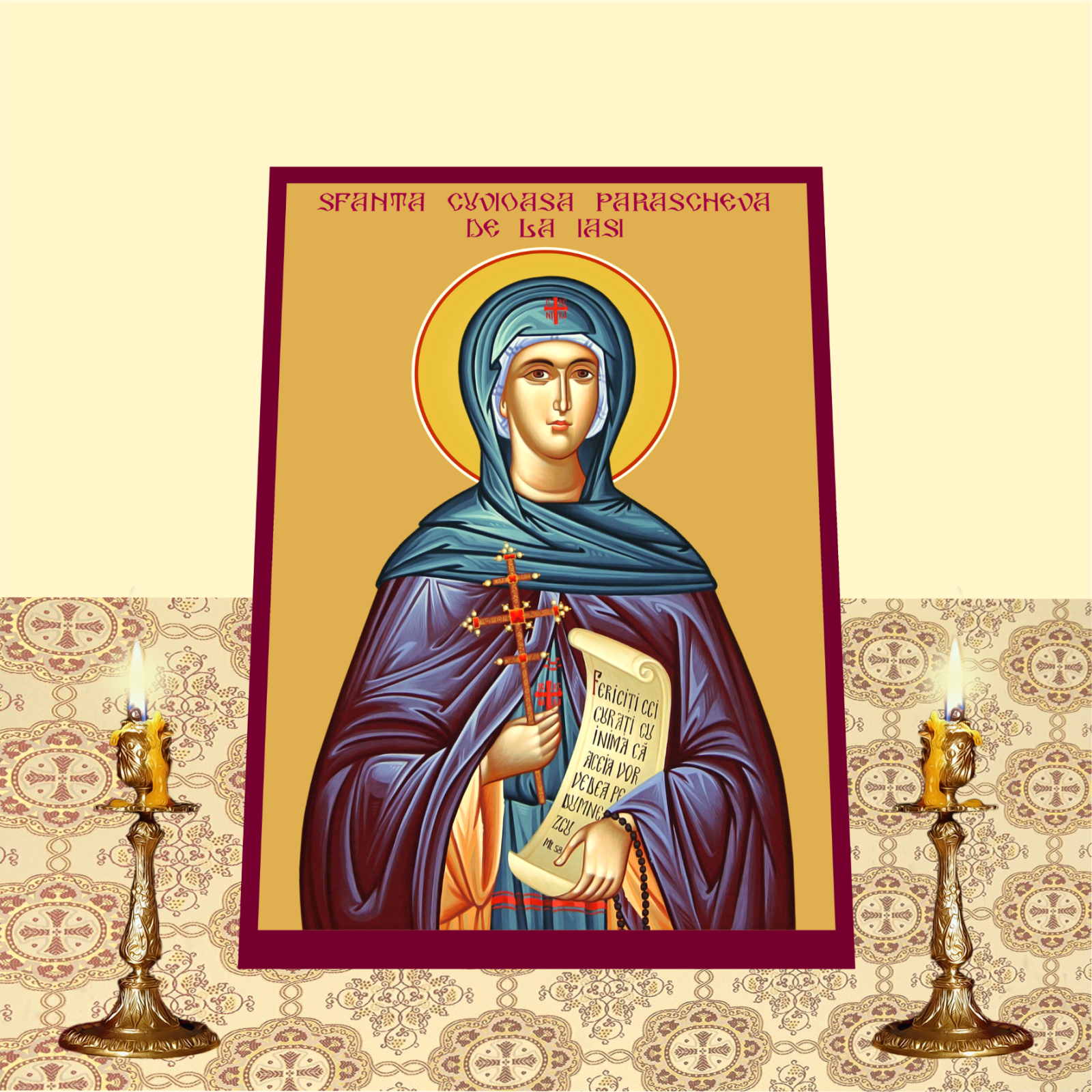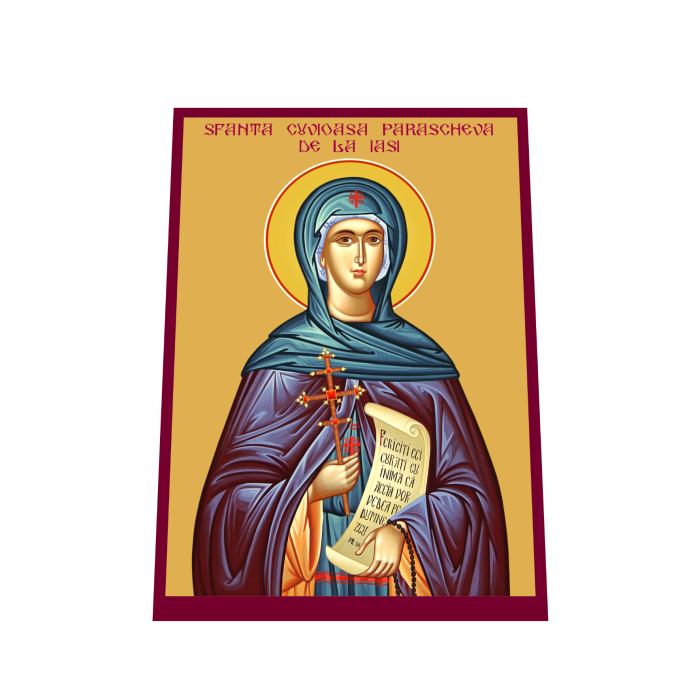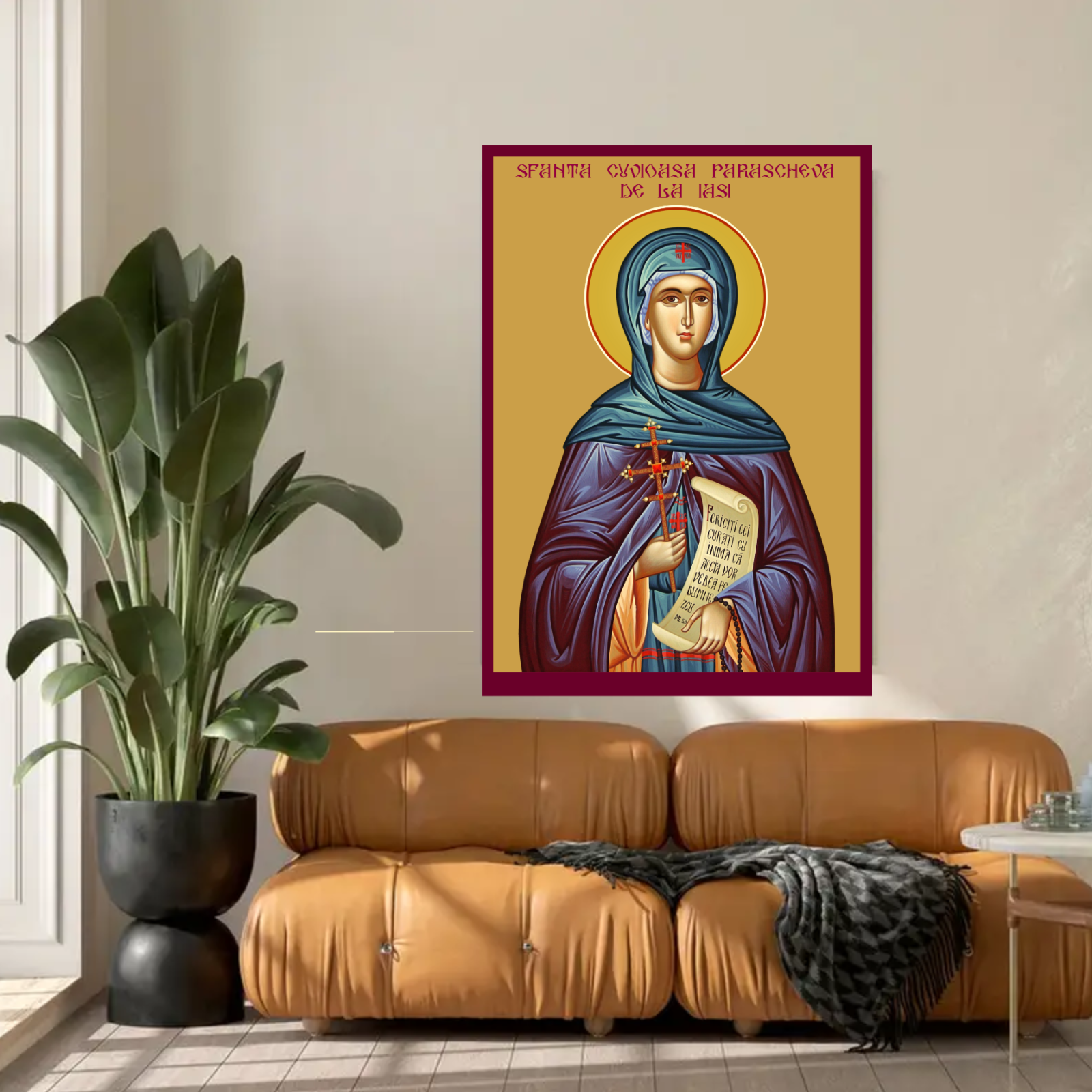 Aceasta icoana o reprezinta pe Sfanta Cuvioasa Parascheva, o mare sfanta a Bisericii Ortodoxe, ale carei moaste se afla la Iasi si sunt o sursa de mare evlavie si mangaiere pentru credinciosi. Sfanta Parascheva este cunoscuta pentru viata sa de rugaciune, smerenie si iubire fata de aproapele, fiind un model de sfintenie si dedicare in fata lui Dumnezeu. Imprimata pe MDF de calitate superioara, folosind tehnologia UV, icoana reda cu fidelitate imaginea acestei mari sfinte, oferind o reprezentare clara si vibranta a chipului ei plin de lumina divina.