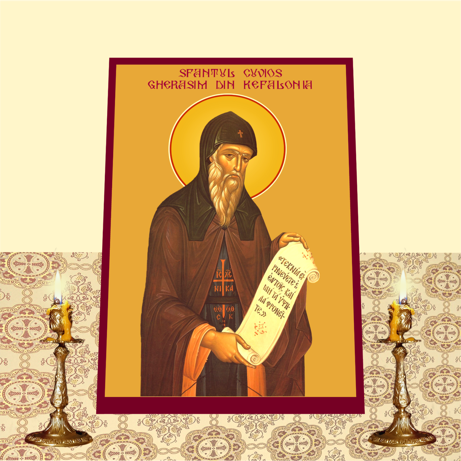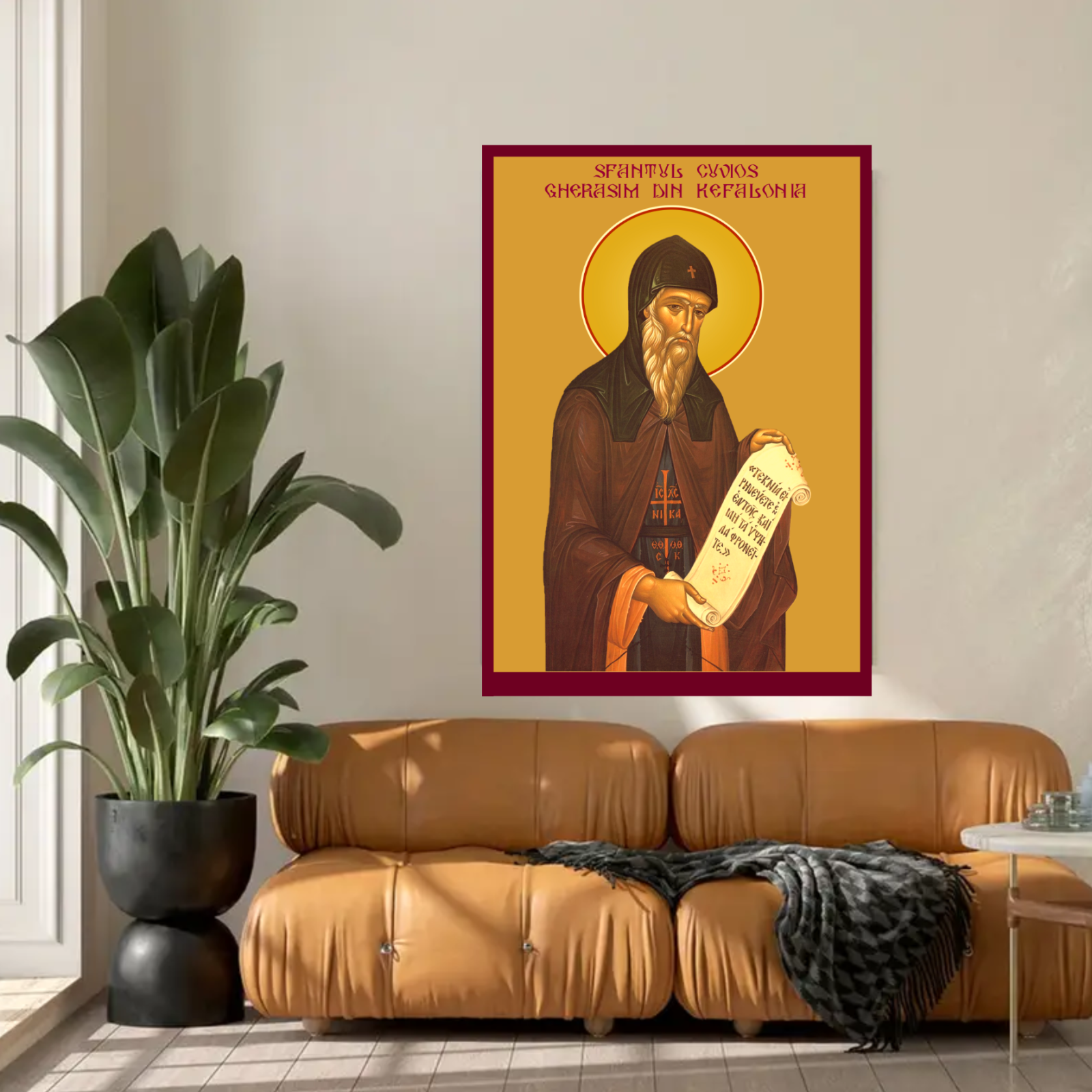 Aceasta icoana il infatiseaza pe Sfantul Cuvios Gherasim din Kefalonia, cunoscut ca protector al celor bolnavi si izbavitor al celor suferinzi de tulburari sufletesti. Reprezentarea este imprimata pe MDF de inalta calitate, folosind tehnologia UV, ceea ce confera culori intense, detalii clare si o rezistenta indelungata in timp. Chipul Sfantului este redat cu solemnitate si blandete, inspirand pace, echilibru si nadejde.