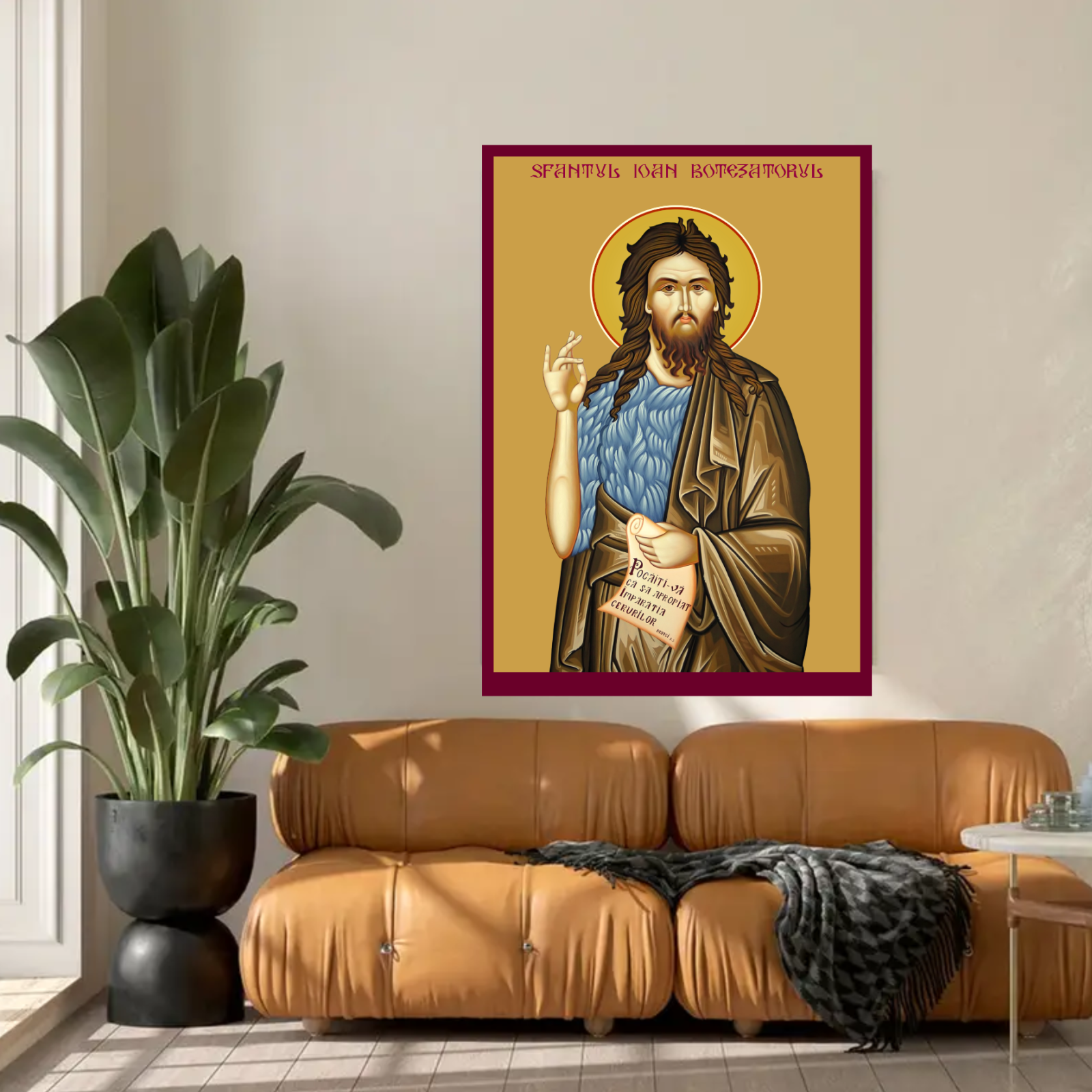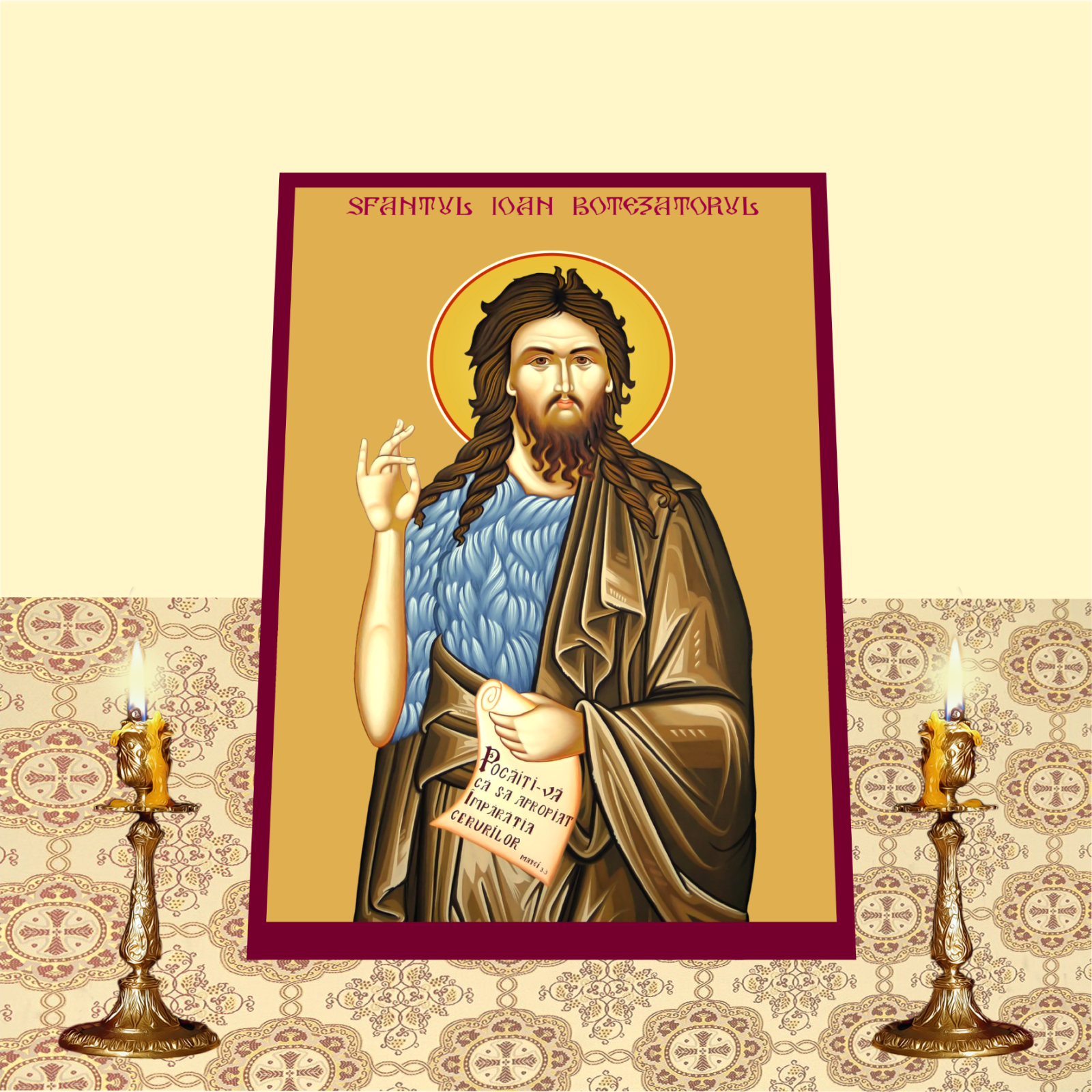 Aceasta icoana il reprezinta pe Sfantul Ioan Botezatorul, precursorul Mantuitorului Iisus Hristos, cunoscut pentru viata sa de pocainta, rugaciune si dedicare totala vointei divine. Sfantul Ioan Botezatorul este simbolul curajului in fata adevarului si al smereniei, fiind martorul divinitatii lui Iisus si cel care a pregatit calea pentru venirea Mantuitorului. Imprimata pe MDF de inalta calitate, icoana este realizata cu tehnologia UV, ce asigura o redare detaliata si clara a chipului sau plin de sfintenie si evlavie.