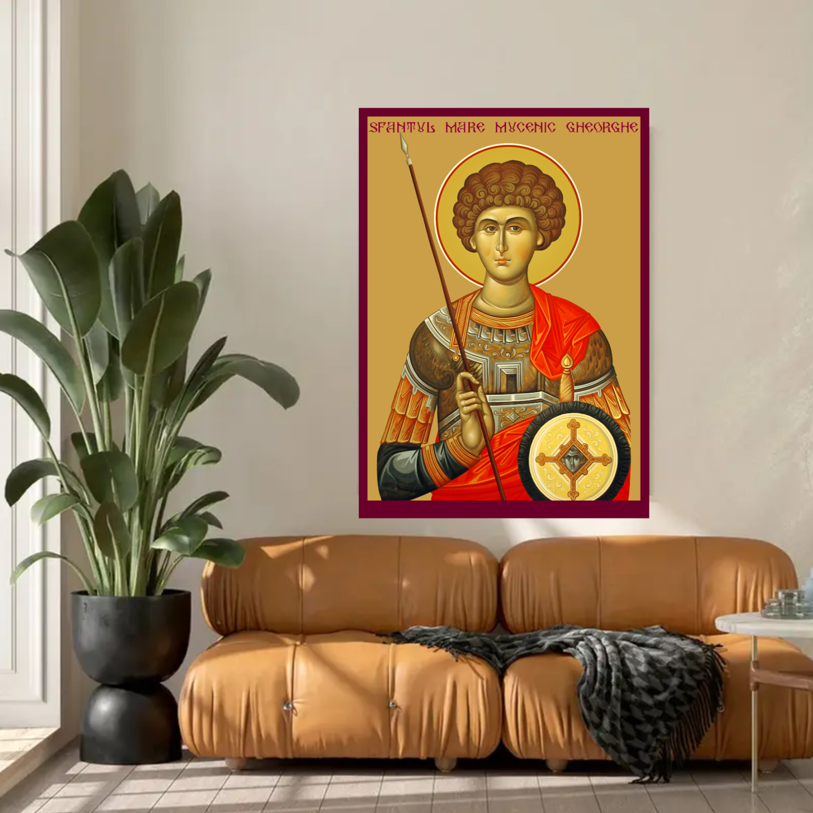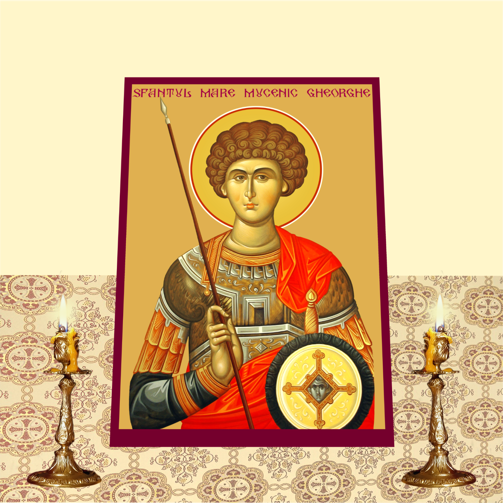 Aceasta icoana il reprezinta pe Sfantul Mare Mucenic Gheorghe, unul dintre cei mai iubiti si venerati sfinti ai Bisericii Ortodoxe, cunoscut pentru curajul sau de a marturisi credinta in fata persecutiilor si pentru jertfa suprema pe care a facut-o pentru Hristos. Sfantul Gheorghe este un simbol al darzeniei in fata raului si al triumfului binelui asupra raului. Imprimata pe MDF de inalta calitate cu tehnologia UV, icoana reda cu fidelitate chipul luminos si plin de tarie al acestui mare mucenic.