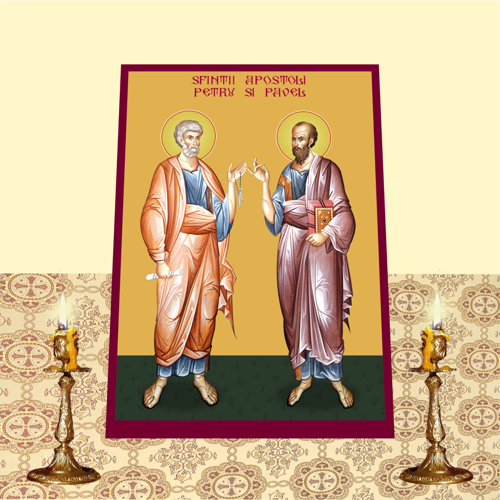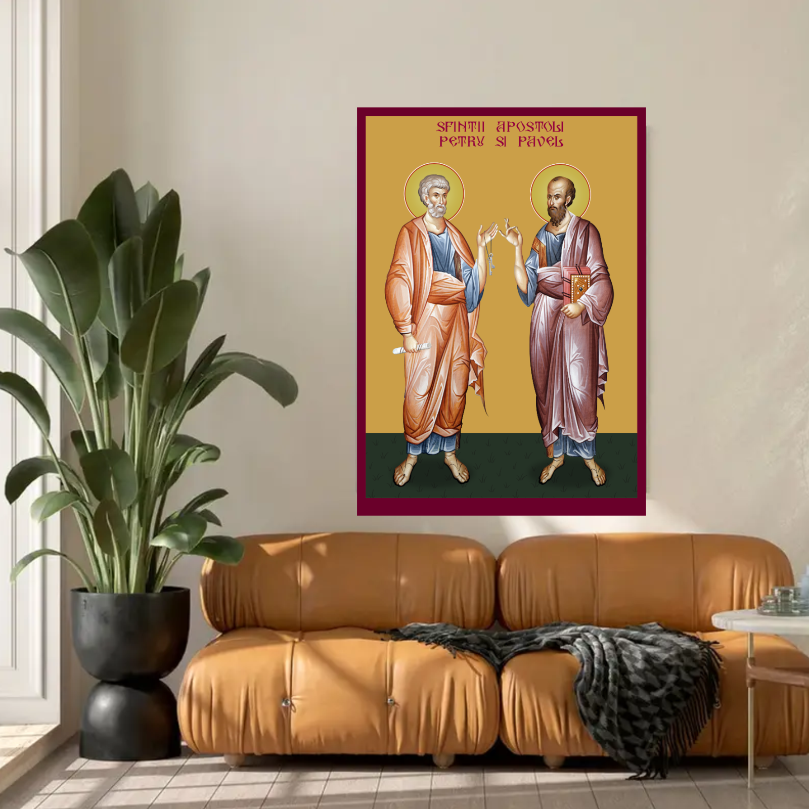 Aceasta icoana il reprezinta pe Sfantul Apostol Petru si pe Sfantul Apostol Pavel, doi dintre cei mai importanti si influenti apostoli ai Bisericii Crestine. Petru, cel ce a fost ales de Hristos ca "stanca" pe care va cladi Biserica, si Pavel, marele misionar si teolog, au avut o misiune cruciala in raspandirea Evangheliei si intarirea credintei. Imprimata pe MDF de calitate superioara cu tehnologia UV, icoana reda cu precizie si frumusete trasaturile si semnele distinctive ale celor doi mari sfinti.