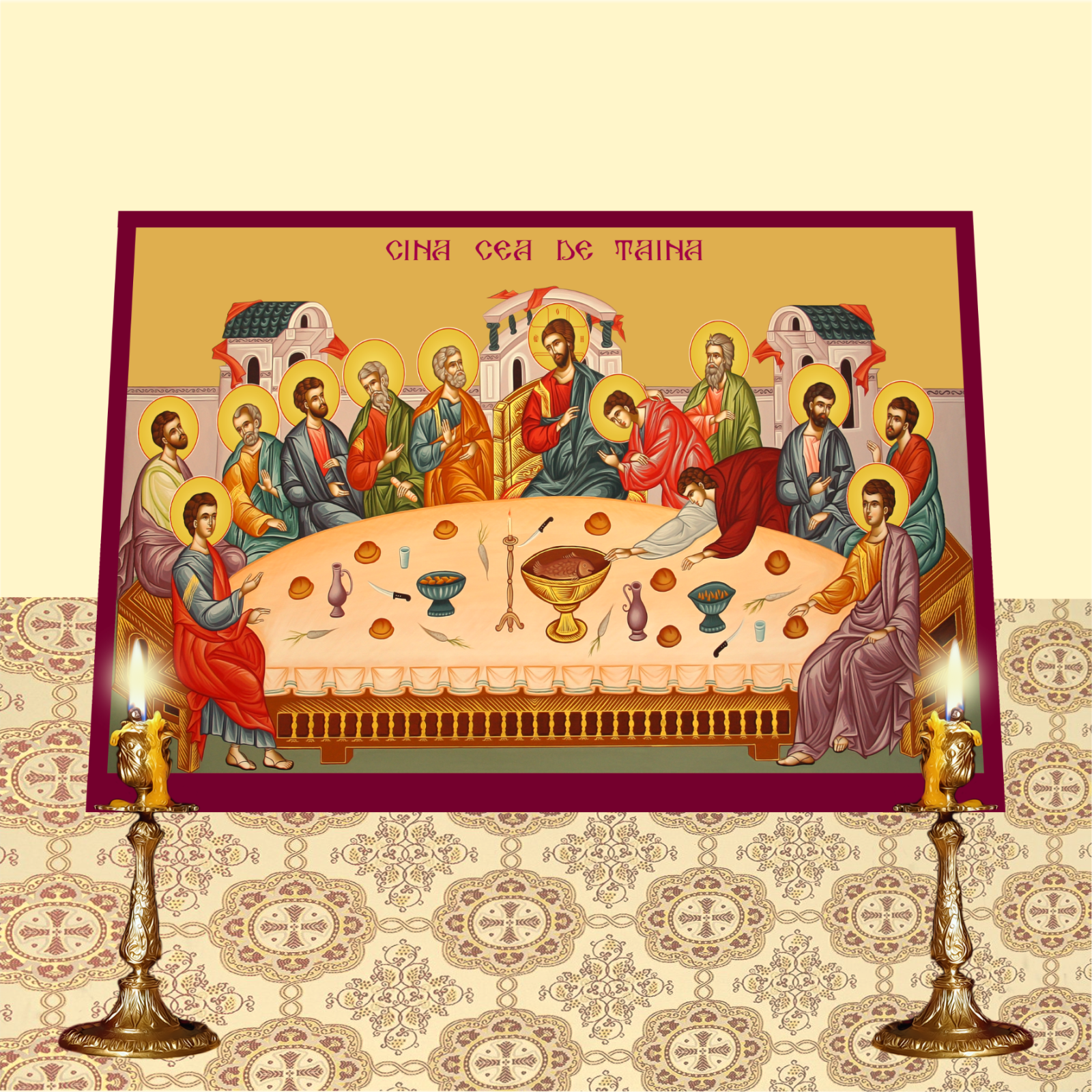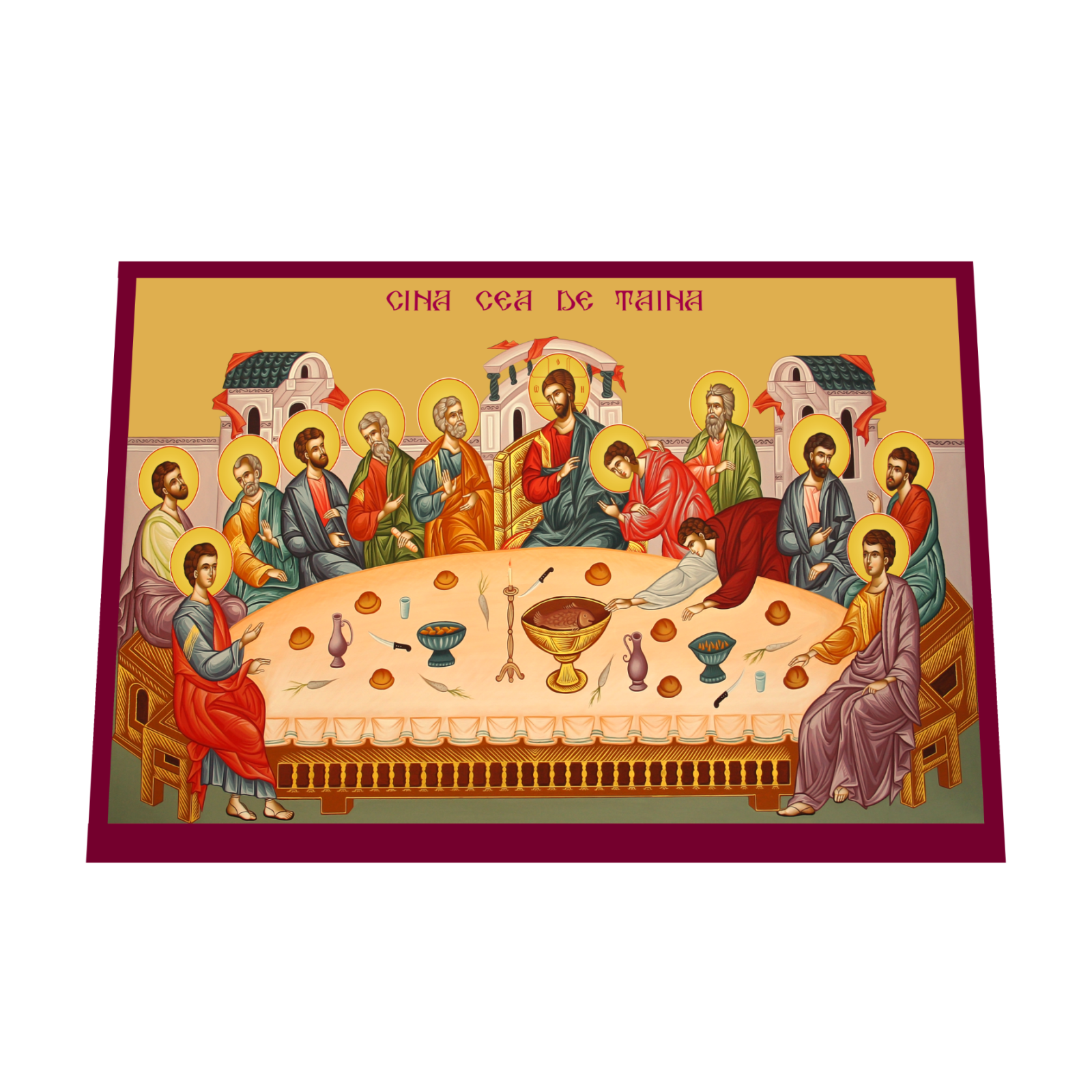 Aceasta icoana reda momentul sacru al Cinei celei de Taina, cand Mantuitorul Iisus Hristos sta impreuna cu Apostolii Sai, inainte de patimile si Invierea Sa. Realizata pe suport MDF de inalta calitate si imprimata prin tehnologia UV, icoana se distinge prin detalii fine, culori vii si rezistenta indelungata, aducand in orice spatiu o atmosfera de solemnitate si comuniune spirituala.
