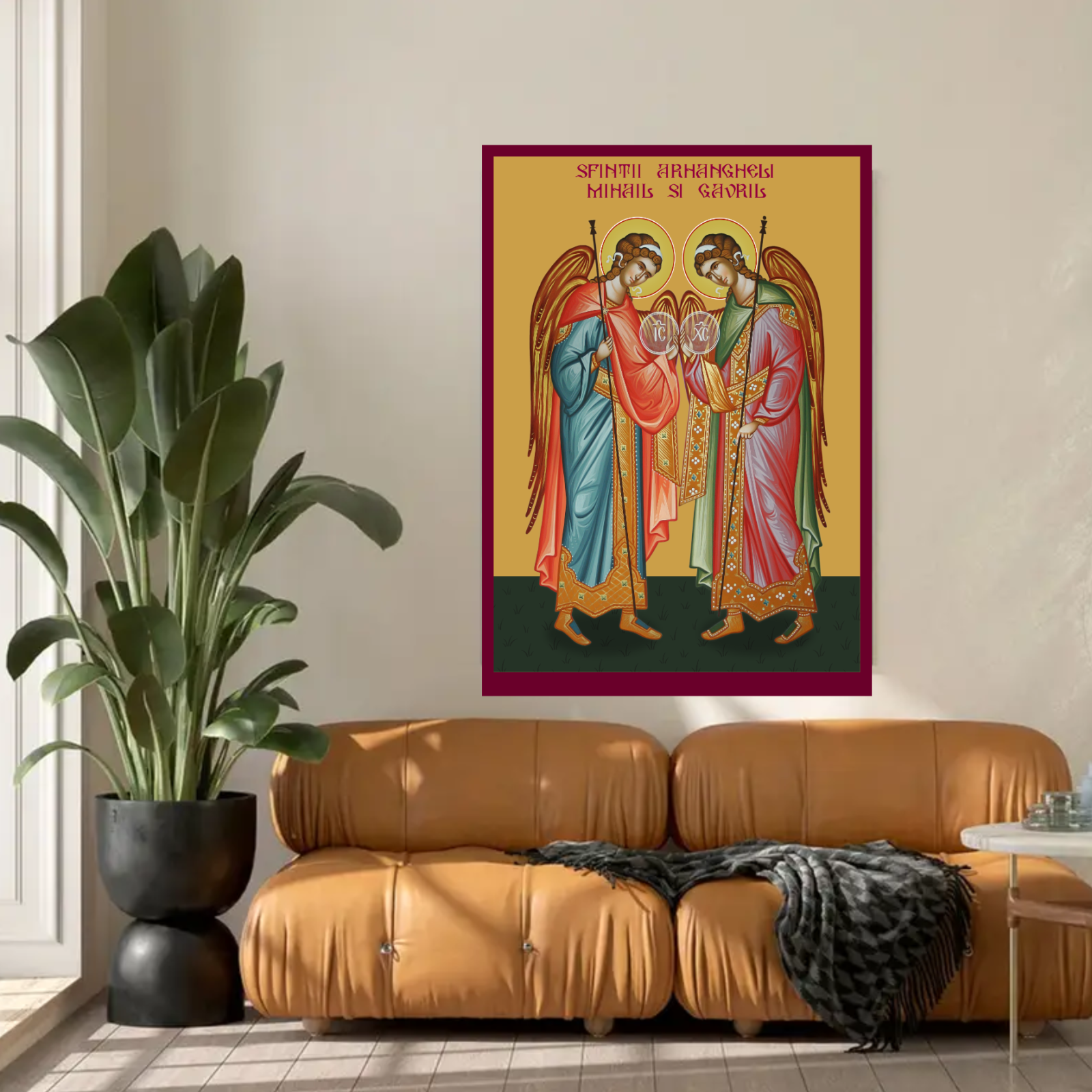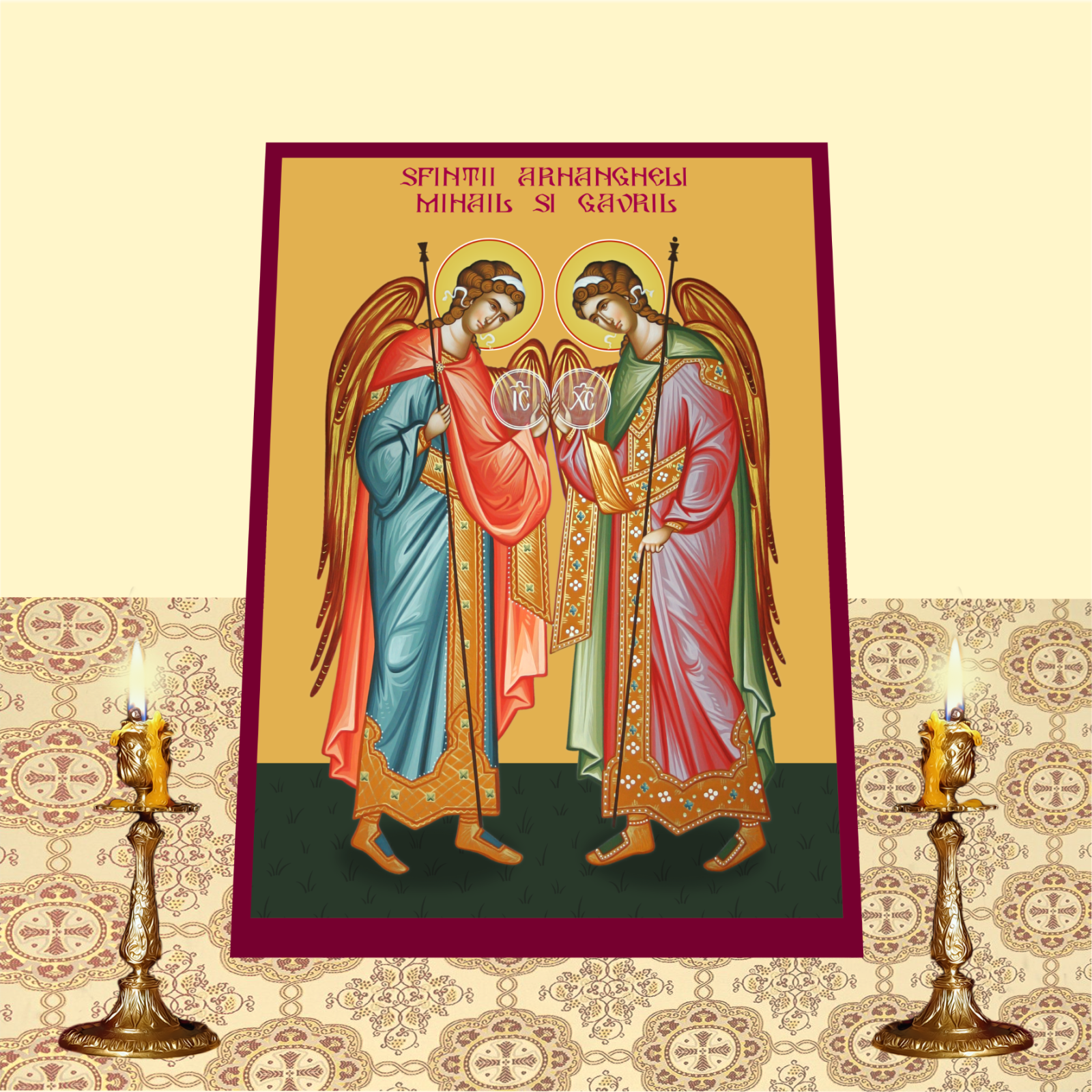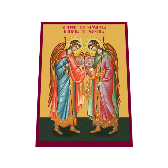 Aceasta icoana ii reprezinta pe Sfintii Arhangheli Mihail si Gavril, capeteniile ostilor ceresti, simboluri ale protectiei divine si ale biruintei luminii asupra intunericului. Este imprimata pe suport MDF de inalta calitate, utilizand tehnologia de imprimare UV, pentru un rezultat durabil si vibrant. Detaliile fine si culorile vii redau cu fidelitate chipurile sfintilor arhangheli, creand o atmosfera de pace, forta spirituala si ocrotire.