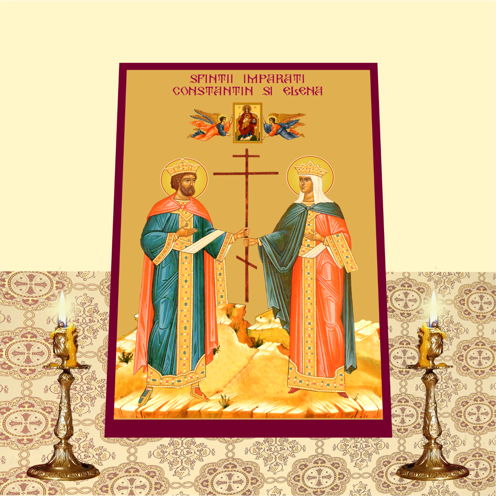 Aceasta icoana ii infatiseaza pe Sfintii Imparati Constantin si Elena, mari aparatori ai credintei crestine si descoperitori ai Sfintei Cruci. Realizata pe suport MDF de inalta calitate si imprimata prin tehnologia UV, icoana ofera un rezultat durabil, cu detalii fine si culori vibrante, ce transmit solemnitatea si lumina spirituala a acestui moment sacru.