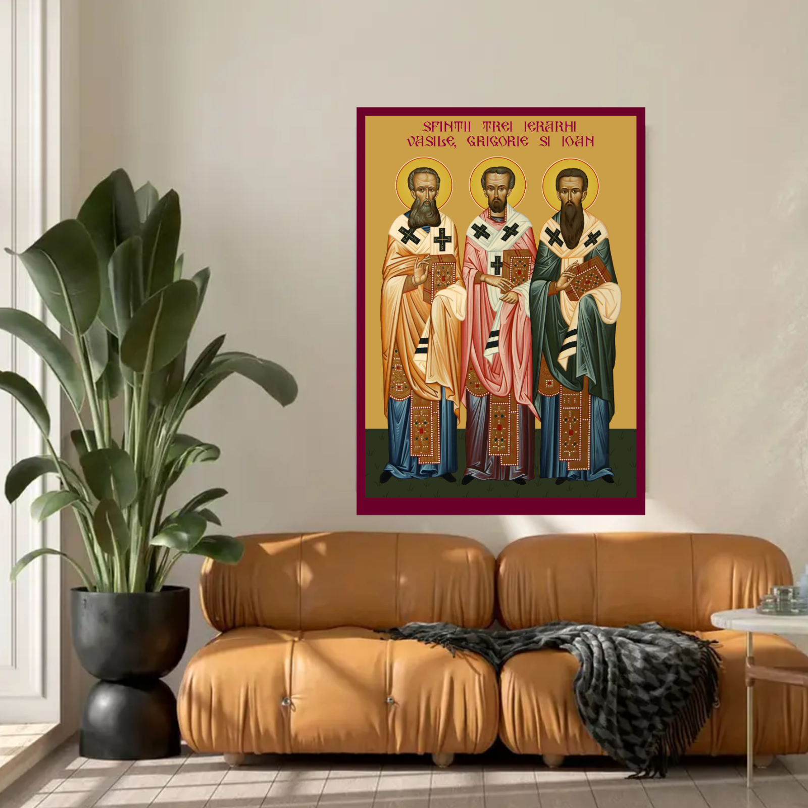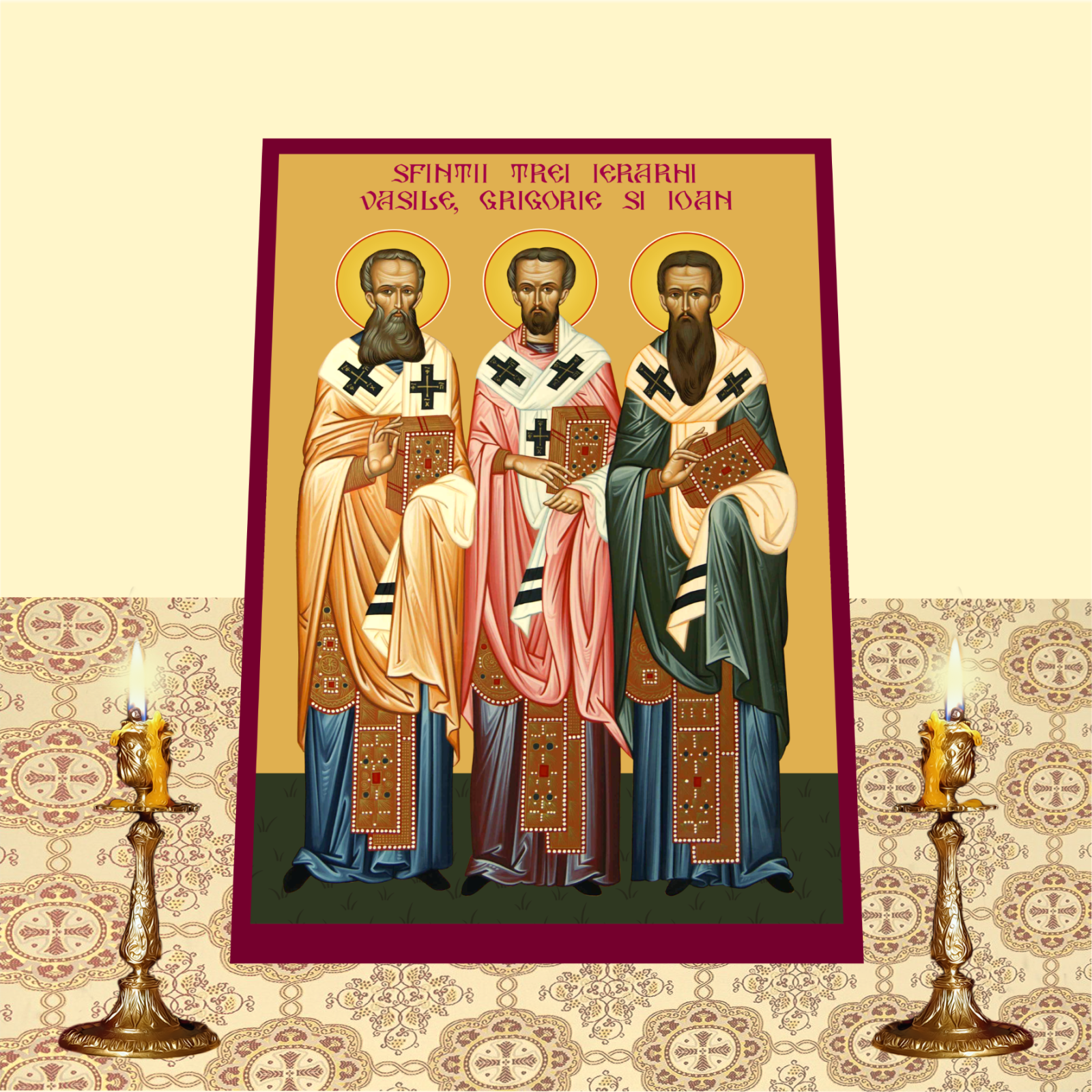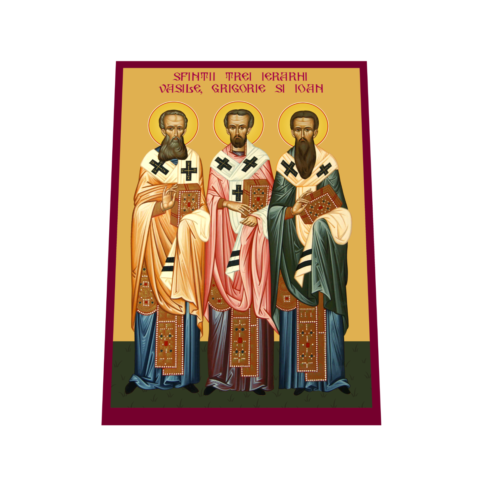 Aceasta icoana ii reprezinta pe Sfintii Trei Ierarhi – Vasile cel Mare, Grigorie Teologul si Ioan Gura de Aur, mari parinti ai Bisericii si luminatori ai Ortodoxiei. Realizata pe suport MDF de inalta calitate si imprimata prin tehnologie UV, icoana se remarca prin culori vii, detalii fine si o durabilitate sporita, redand cu solemnitate chipurile acestor mari sfinti.