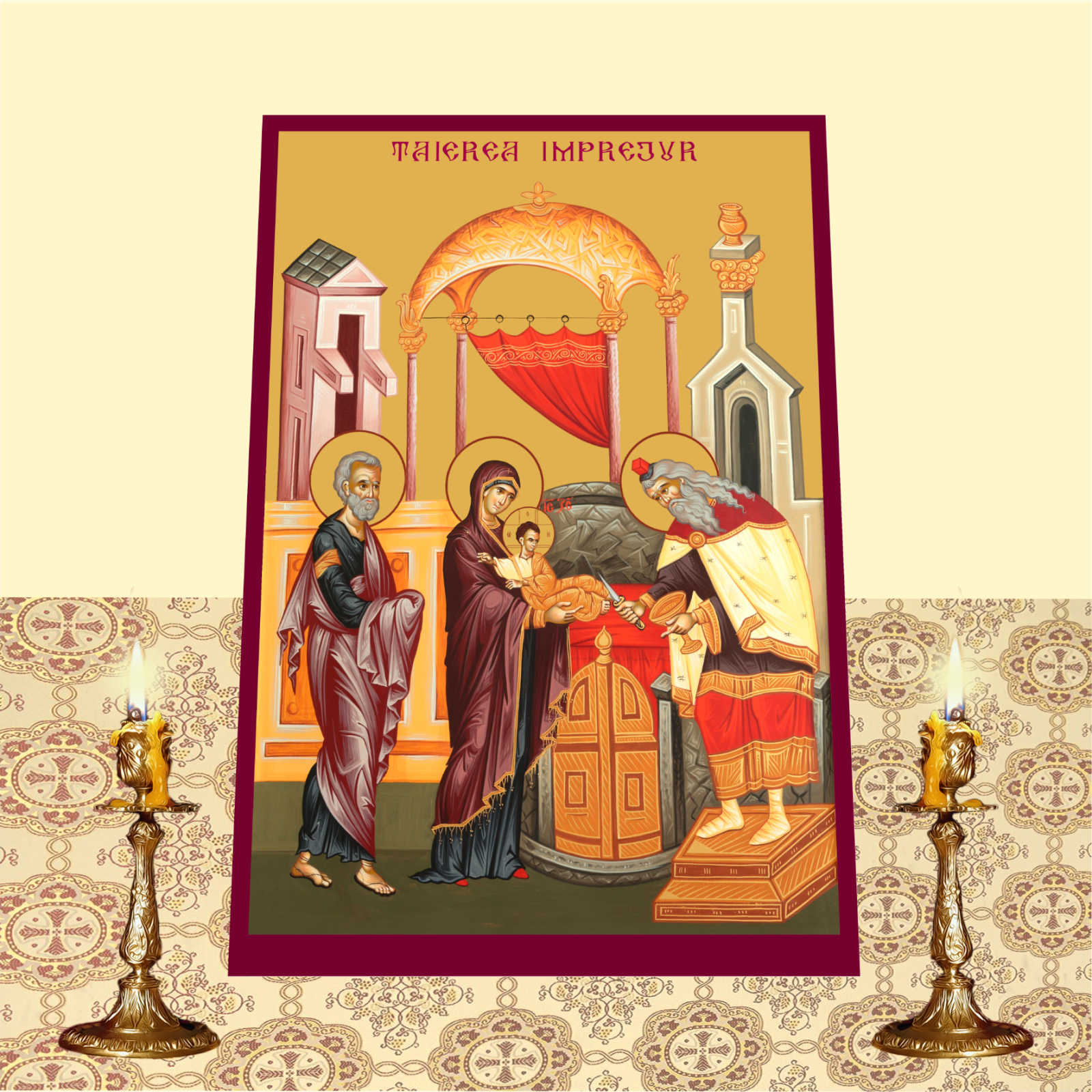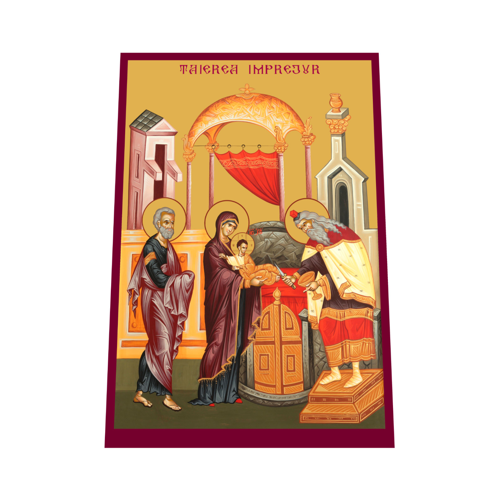 Aceasta icoana reprezinta Taierea Imprejur a Domnului, un moment semnificativ in viata Mantuitorului Iisus Hristos, cand, conform traditiei evreiesti, a fost taiata preputul Pruncului Iisus la opt zile dupa nastere, semn al apartenentei la poporul ales si al implinirii Legii Vechi. Imprimata pe un suport MDF de inalta calitate, icoana este realizata cu tehnologia UV, asigurand culori intense si detalii clare care raman durabile in timp.