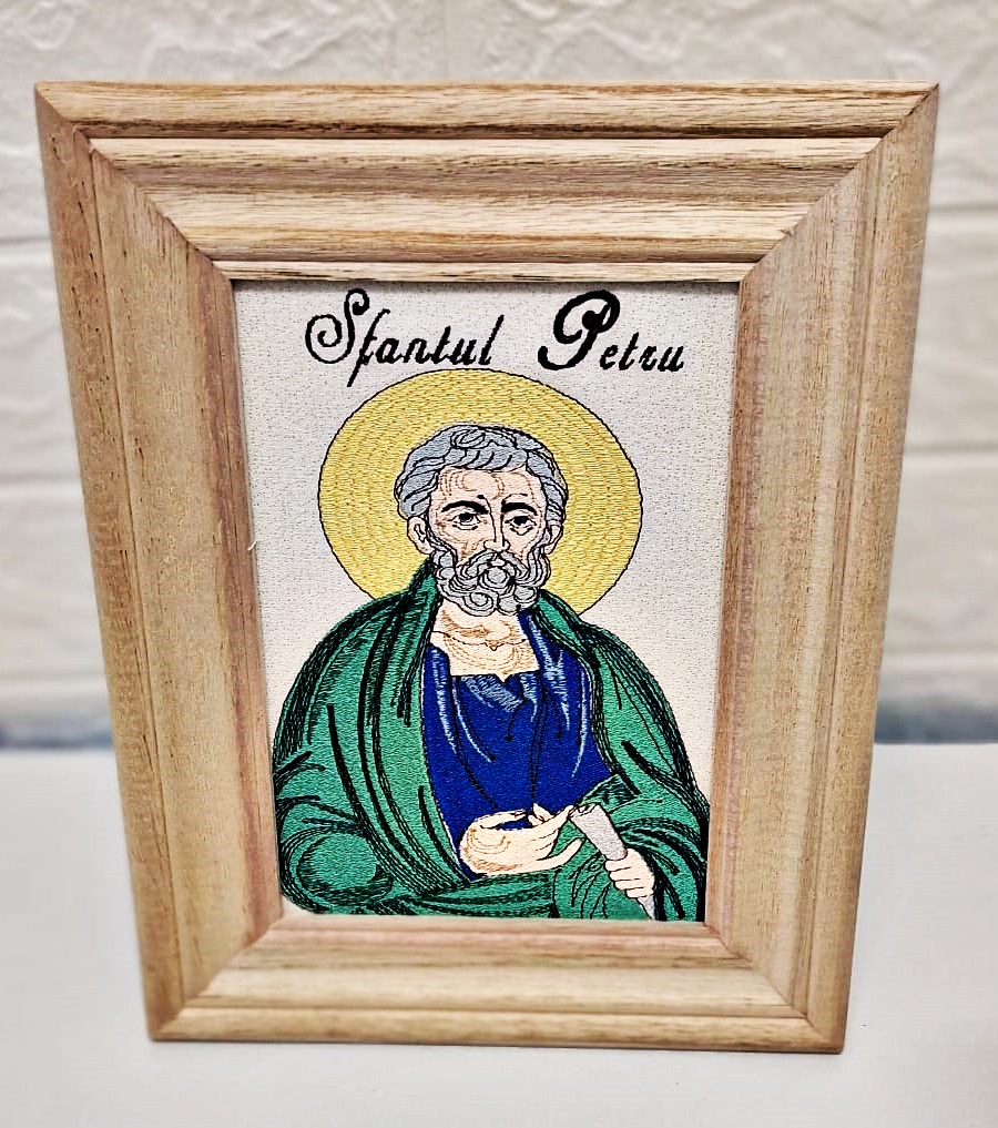 Icoana brodata cu Sfantul Petru la dimensiunea 15*20 cm. Aceasta este inramata.
