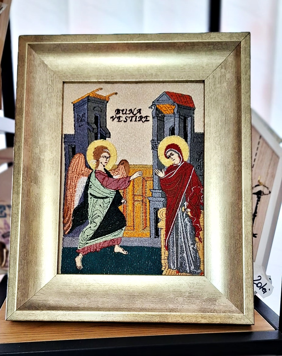 Icoana brodata cu Buna Vestire la dimensiunea 15*20 cm. Aceasta este inramata.